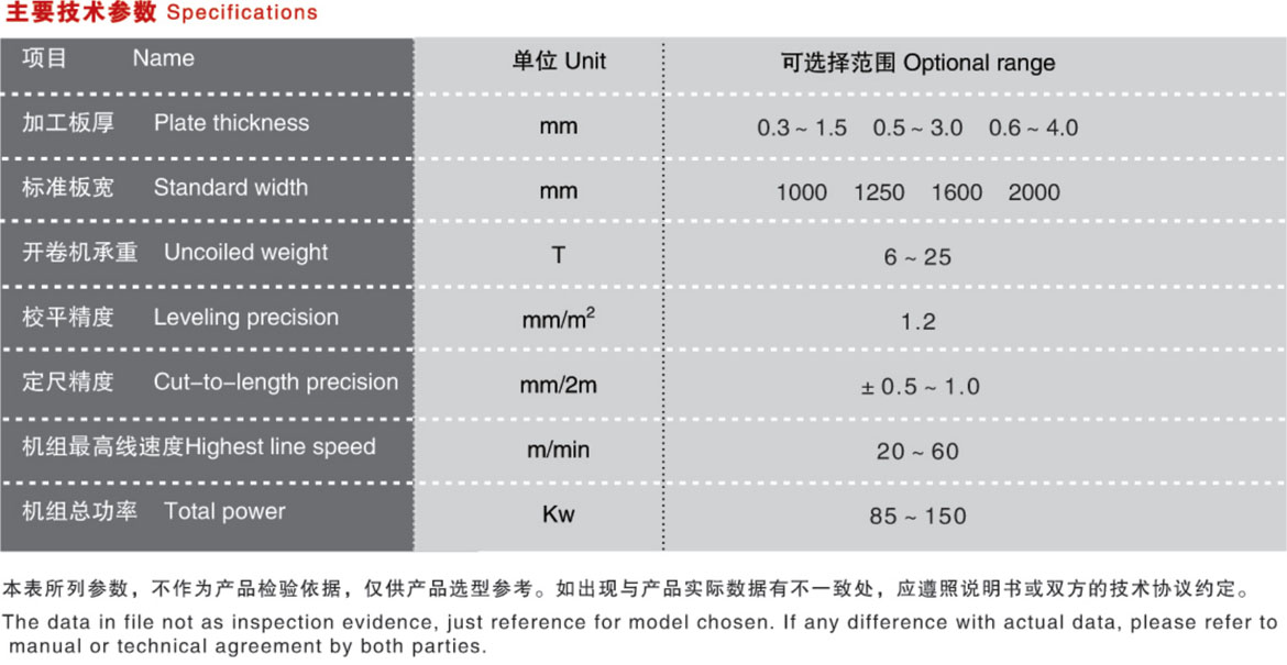 性能特点: 该生产线是将较薄金属卷板整平、剪切成块状板材的专用设备。通常由上料小车、开卷机、引头装置、校平主机、活动过桥、导向纠偏装置、定尺机构、覆膜装置、飞剪主机、输送工作台、气动排料架、液压升降垛料台、运料滚道台及液压系统、电气控制系统等组成,协同动作PLC控制。 本设备主要用来加工冷轧碳钢卷板、不锈钢卷板及有色金属卷板等,可以根据客户的需求和工件加工的需要,选用六重式、四重式或二重式校平主机。 根据客户要求,校平可采用初、精两级校平机校平;定长送剪可采用普通机械电器协同动作、数字变频技术或交流伺服技术;剪板机可配用普通机械、液压机型,电磁离合器、气动离合器传递动力的高速闸式剪板机,移动跟踪的追剪以及回转式飞剪机。配套相关成型机床可作更大范围功能延伸。
